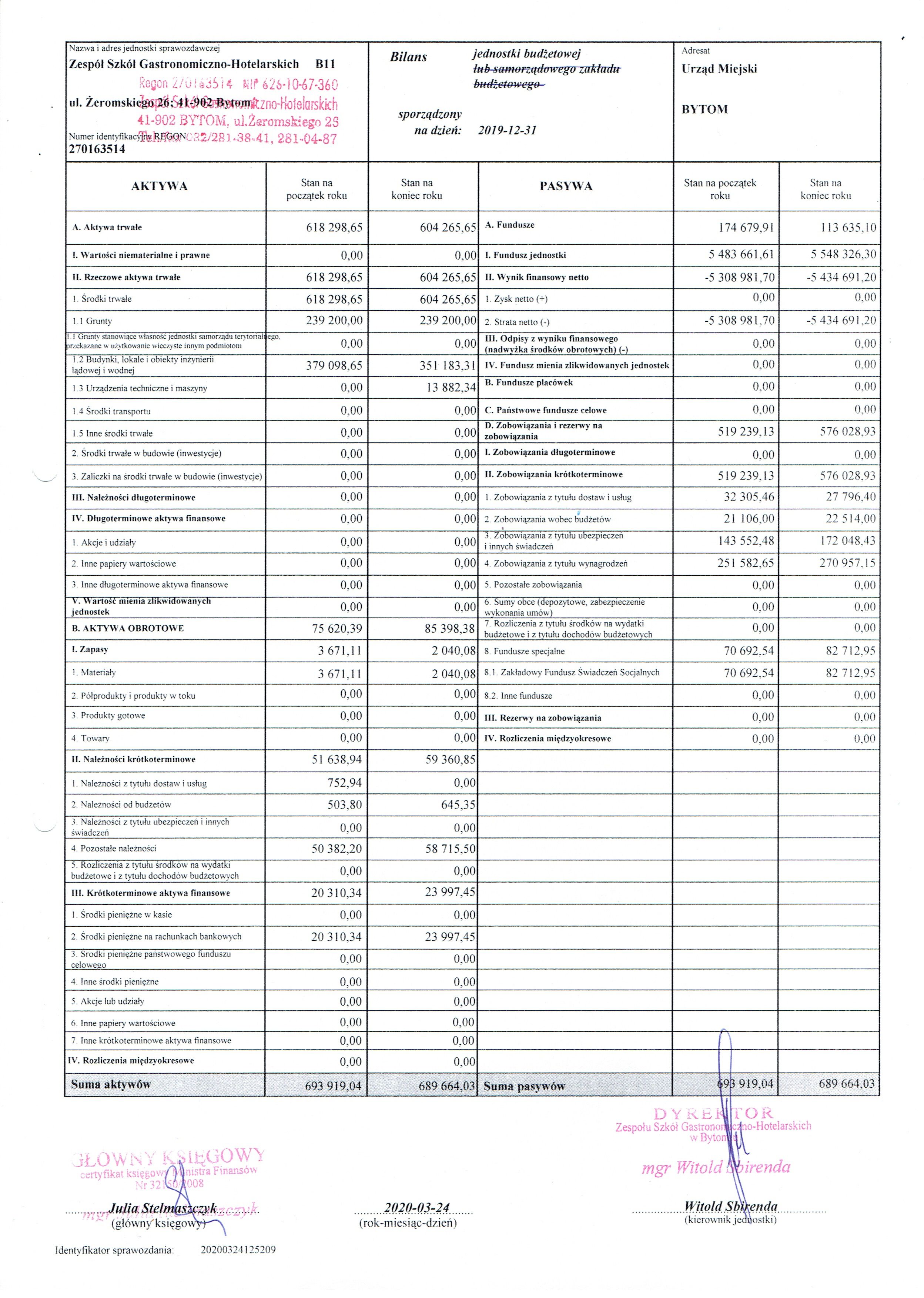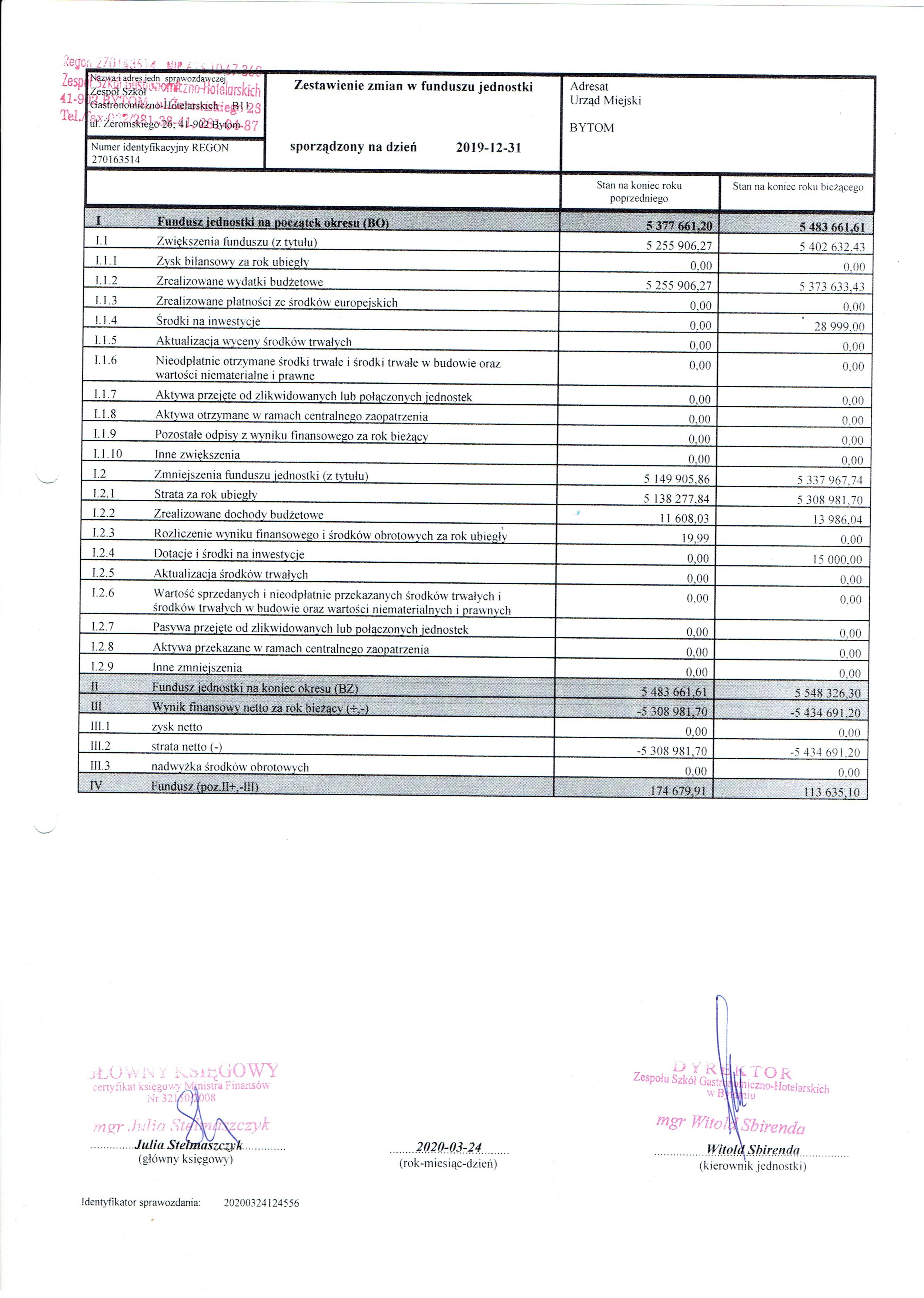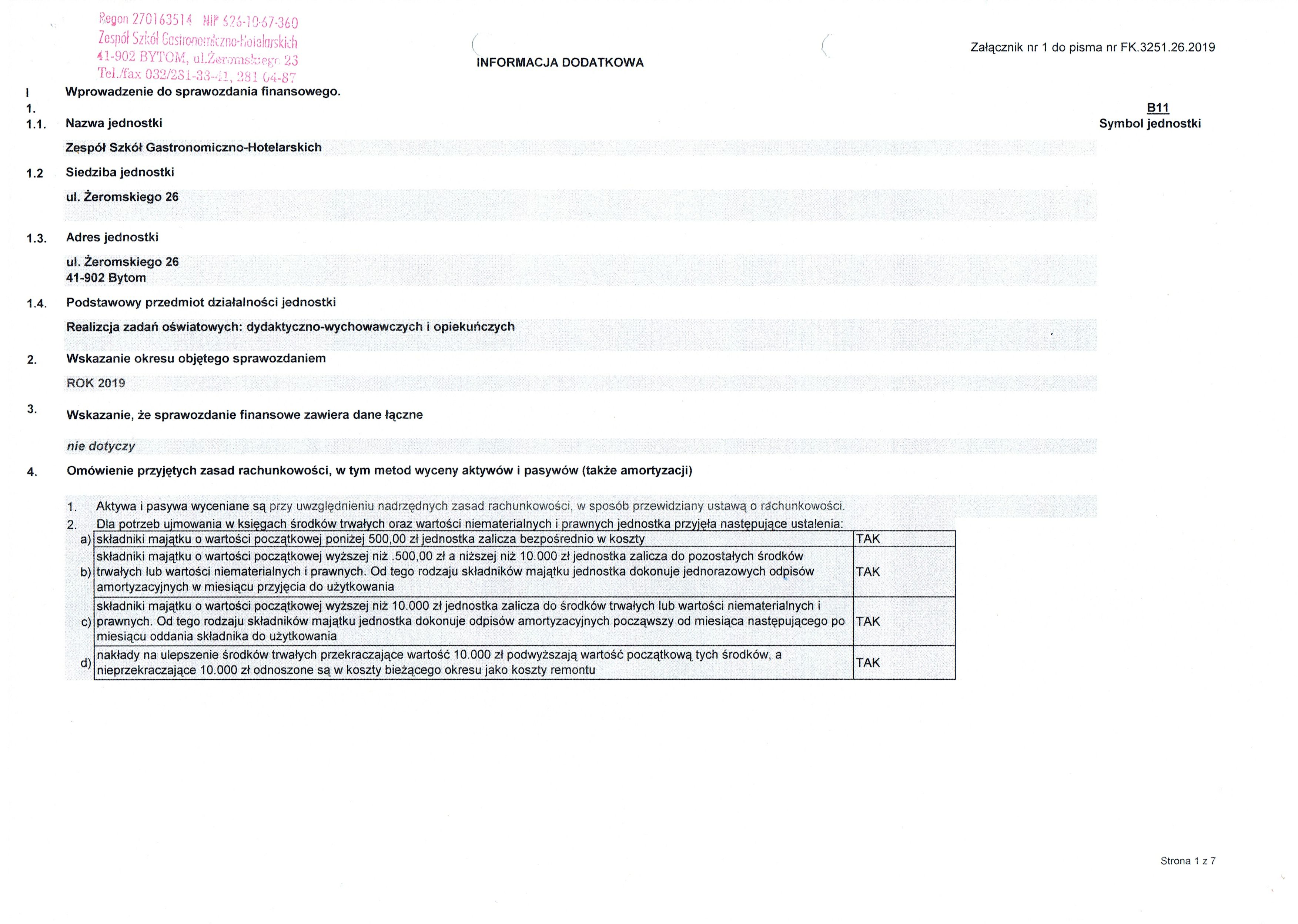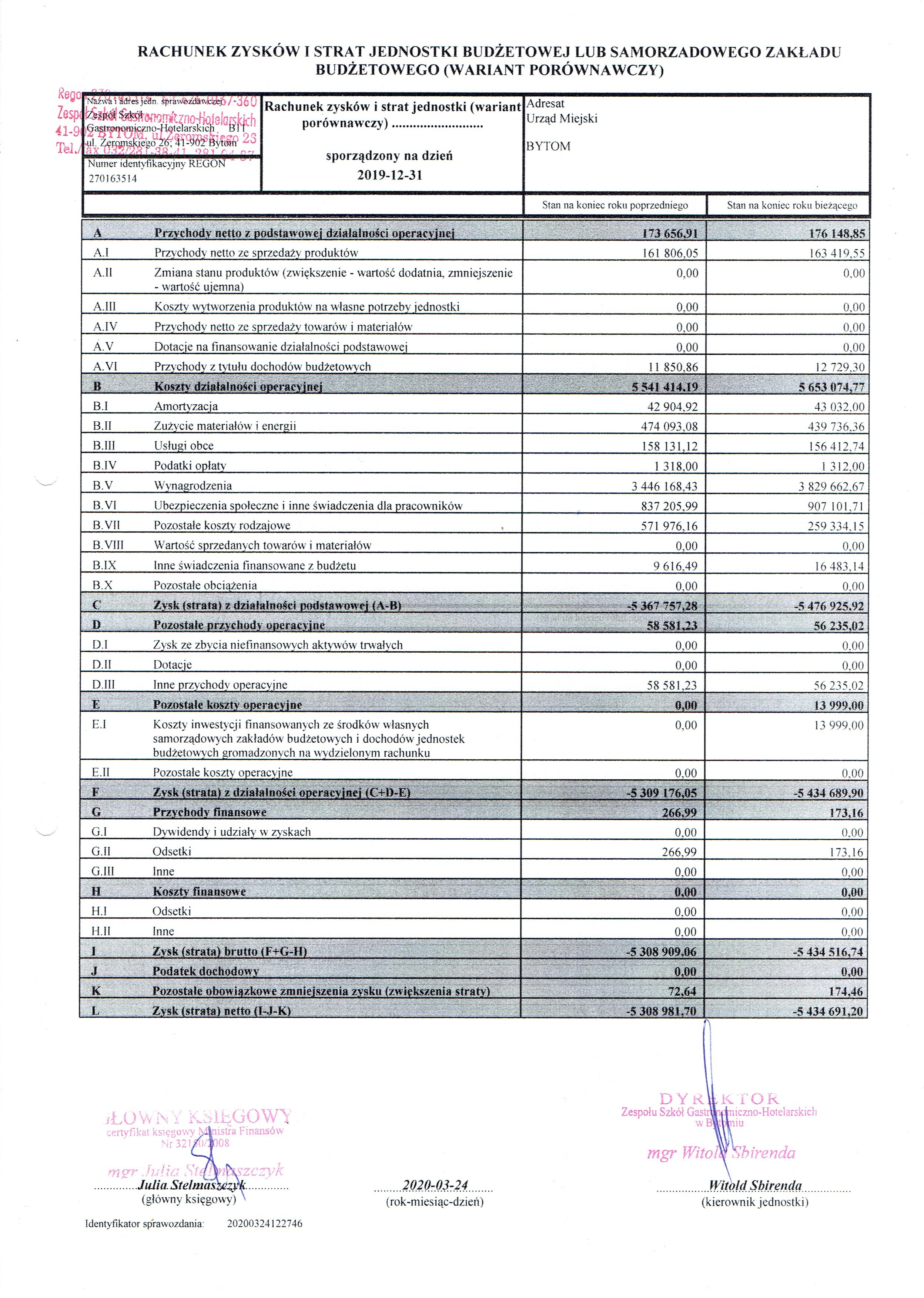 Sprawozdania finansowe Zespołu Szkół Gastronomiczno-Hotelarskich w Bytomiu za rok 2019